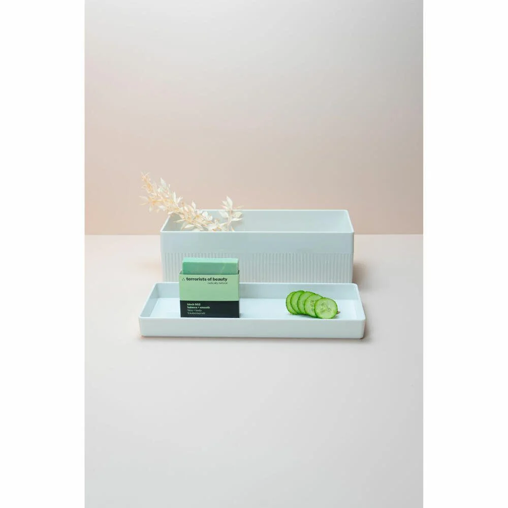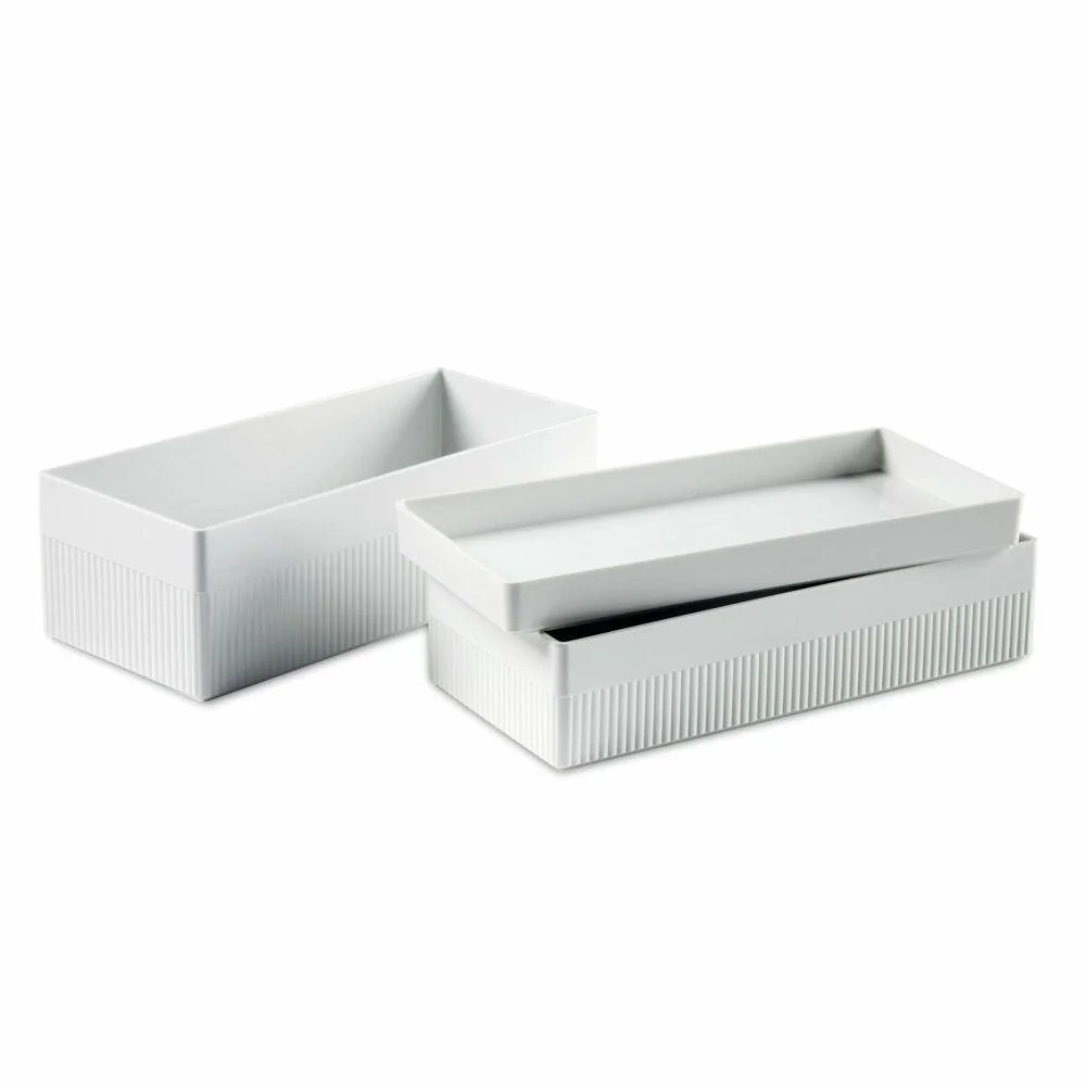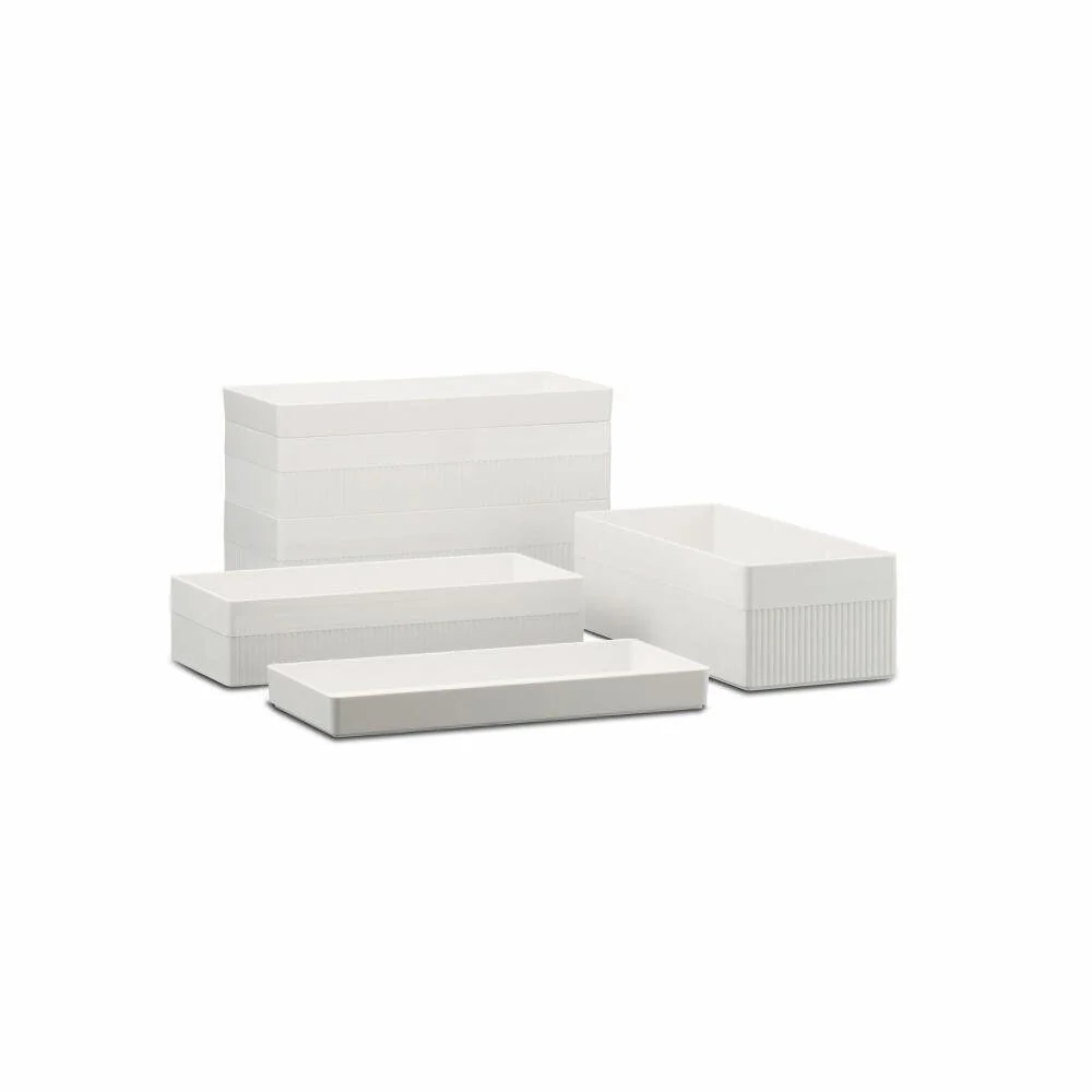 Die Stapelbox Kali L ist eine weiße Aufbewahrungsbox aus der Serie Kali, entworfen von Doshi Levien. Sie bietet eine kompakte Lösung zum Ordnen und Stapeln von Gegenständen und lässt sich mit den kleineren Modellen der Serie kombinieren.