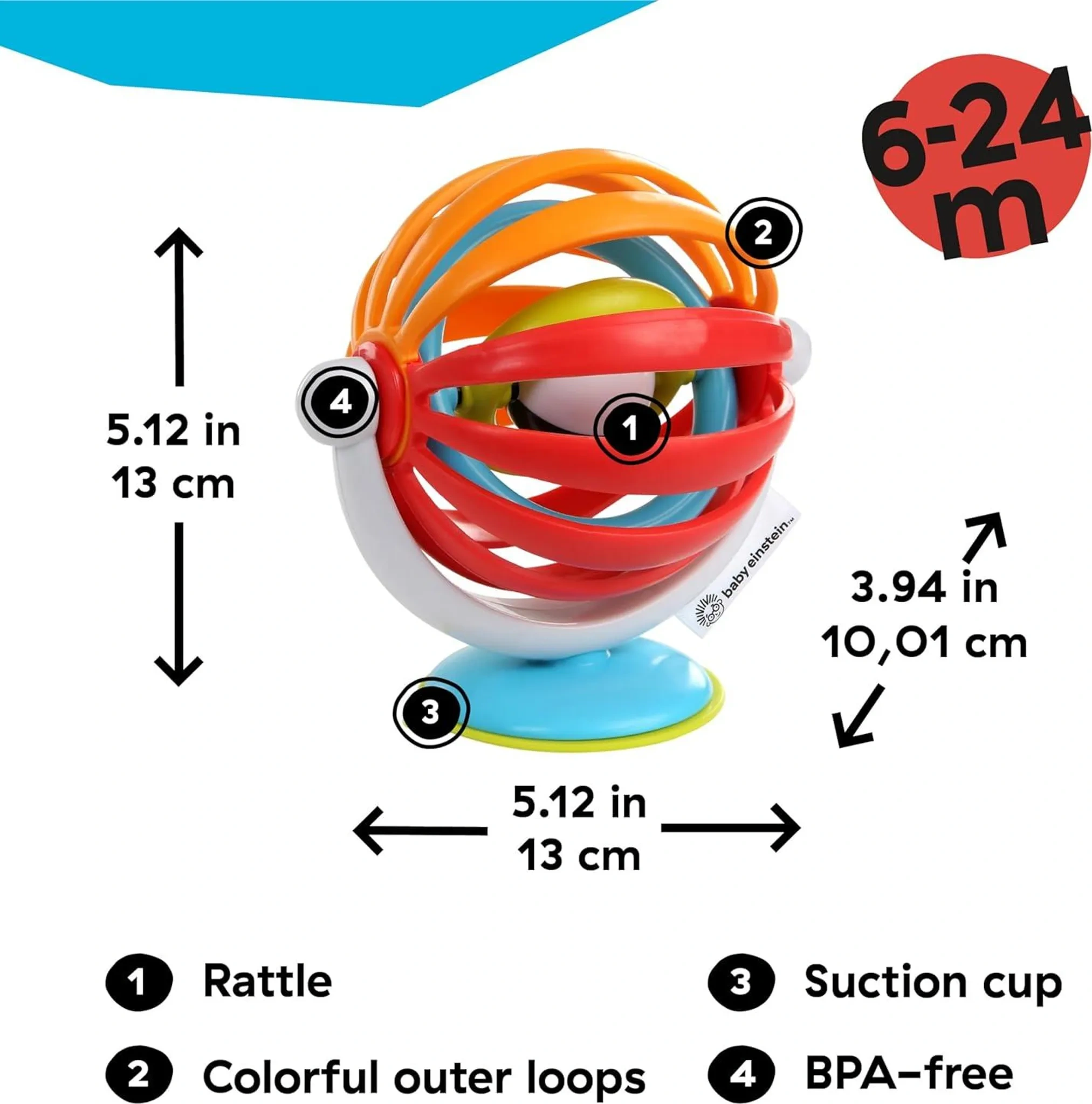 Der Baby Einstein Sticky Spinner verwandelt jeden Tisch in ein spannendes Aktivitätencenter. Die bunten Ringe drehen sich in entgegengesetzte Richtungen und fördern so die Hand-Augen-Koordination sowie die Feinmotorik Ihres Babys. Dank der starken Saugnapfbasis bleibt der Spinner sicher an Ort und Stelle, egal ob auf dem Hochstuhl oder unterwegs.