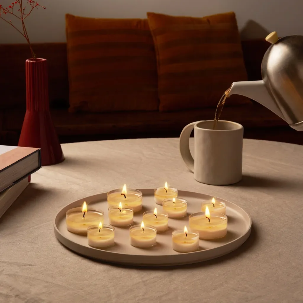 Hergestellt ohne Palmöl und aus natürlichem, veganem Wachs, entstehen die Kerzen laut Hersteller mit einem handwerklichen Ansatz, der Umweltaspekte und traditionelle Fertigung verbindet. Die durchsichtigen Tassen zeigen die Flamme klar sichtbar und unterstützen die Wirkung in mehreren Teelichthaltern.
