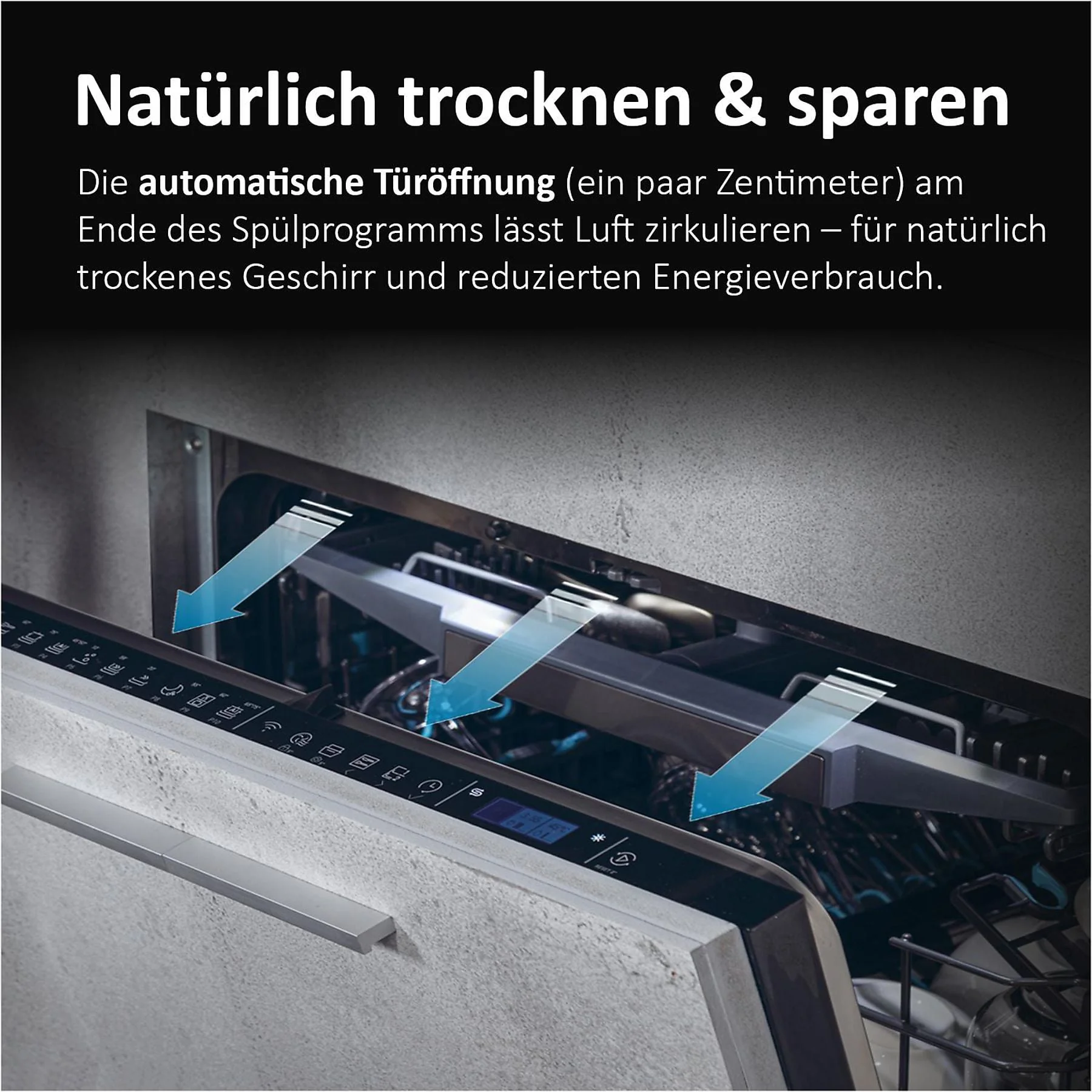 Der vollintegrierbare Geschirrspüler HAIER XI 4C4E1B-84 fügt sich dezent in die Küchenfront ein und bietet mit 14 Maßgedecken spürbar viel Platz. Ein bürstenloser Inverter-Motor und durchdachte Spülsysteme unterstützen einen ressourcenschonenden Betrieb. Praktische Details wie die automatische Türöffnung für natürliches Trocknen und ein flexibel höhenverstellbarer Oberkorb erleichtern den Alltag spürbar.