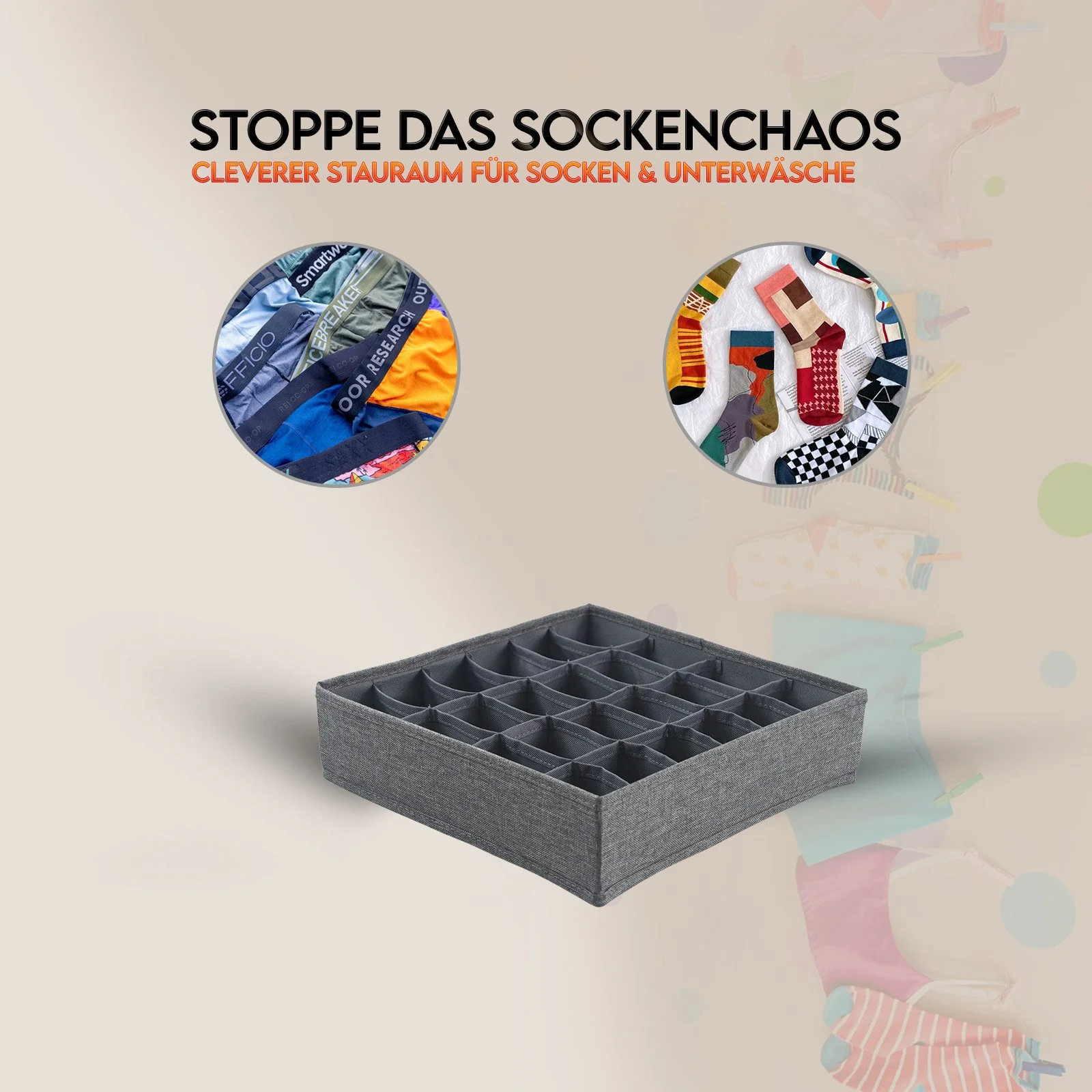 Die Box eignet sich zur geordneten Ablage von Socken und Unterwäsche in Schubladen oder zur Nutzung im Kleiderschrank und auf Reisen. Pflegehinweis: Das Material ist pflegeleicht; die Kartonverstärkung gewährleistet Stabilität im Gebrauch und ermöglicht gleichzeitig das Zusammenfalten zur platzsparenden Aufbewahrung.