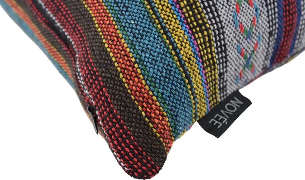 Der Bezug besteht aus einer Baumwoll-Leinen-Mischung im Canvas-Stil und ist beidseitig bedruckt. Verschlossen wird der Bezug mit einem Reißverschluss, das Innenkissen ist im Lieferumfang enthalten. Zur Pflege empfiehlt sich ein schonendes Handwaschverfahren, damit Form und Farbe erhalten bleiben.