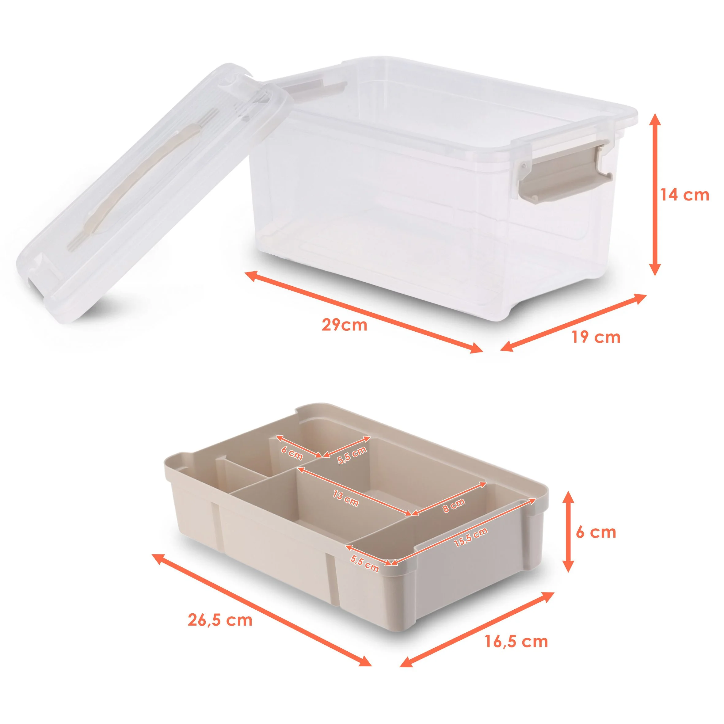 Das Gehäuse ist transparent/beige gehalten, sodass Inhalte sichtbar bleiben. Der Klippverschluss sorgt für sicheren Halt, während die herausnehmbaren Einsätze flexibles Sortieren ermöglichen.