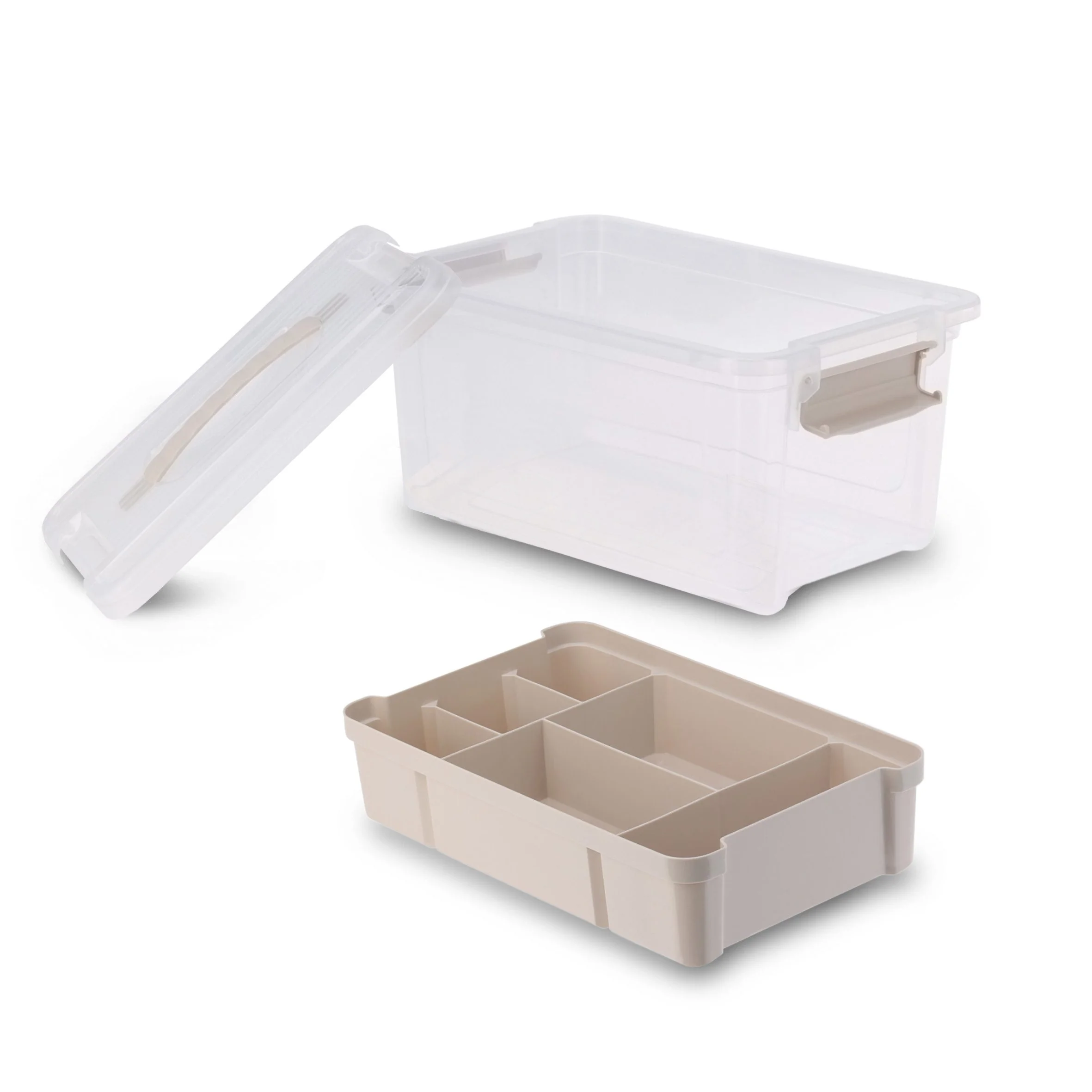 Diese Kunststoff-Aufbewahrungsbox vereint übersichtliche Sortierung mit mobiler Handhabung. Als Nähkästchen mit herausnehmbarem Einsatz konzipiert, eignet sie sich ebenso als Organizer für Handarbeit, Malen, Basteln, Büro und Badezimmer. Die transparente Optik mit beige-farbenen Akzenten erleichtert den Blick auf den Inhalt, während ein integrierter Tragegriff den Transport vereinfacht.