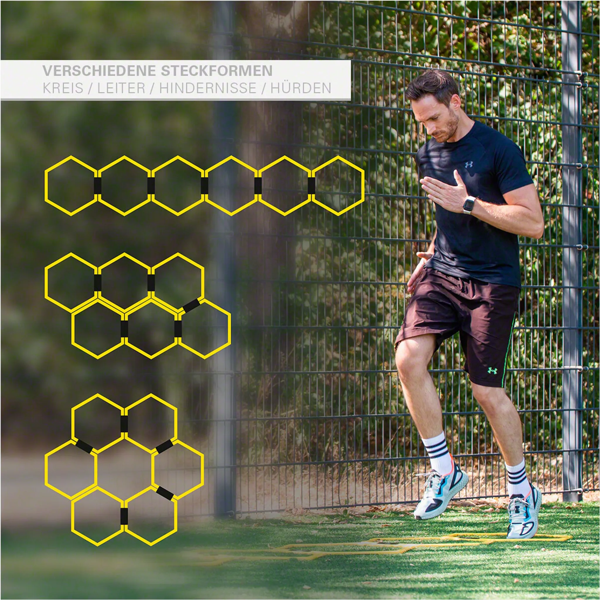 Durch die freie Anordnung der Gitter können individuelle Trainingsparcours erstellt werden. Die Sechsecke lassen sich sowohl flach auslegen als auch aufstellen, um sie als kleine Hürden zu nutzen. Das leichte, aber robuste Material ist wetterfest und widerstandsfähig – perfekt für den Innen- und Außeneinsatz.